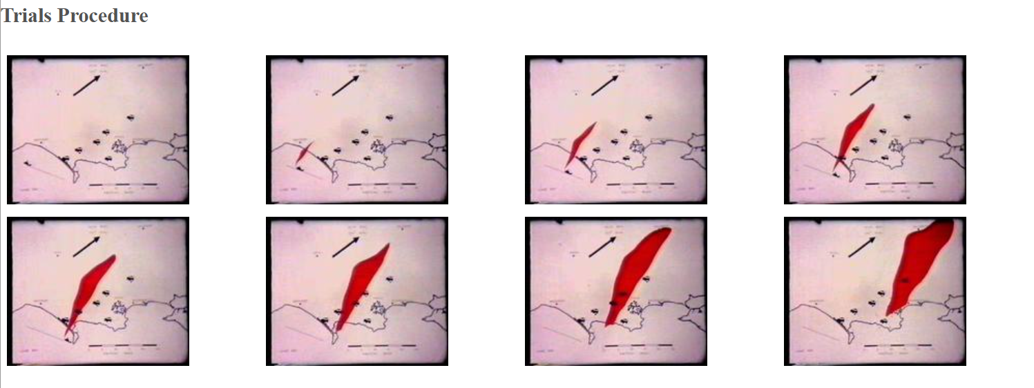 Kadry z animacji przedstawiającej przebieg badań; pokazują one statek rozpylający środki chemiczne płynący prostą linią przez zatokę Lyme Bay i rozpryskujący bakterie – powstała w ten sposób ogromna chmura aerozolu bakteryjnego jest przenoszona na ląd przez dominujący wiatr – mobilne zespoły naukowców z Porton próbują pobrać próbki chmury, gdy przemieszcza się ona w głąb lądu.
