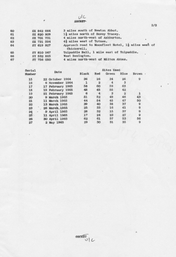 Obszarem badań dla tych eksperymentów był głównie południowy i zachodni Dorset. Tak jak poprzednio, ogromne ilości żywych bakterii (E.coli i BG) zostały rozpylone z ETV ICEWHALE, a próbki powstałej chmury aerozolu zostały pobrane przez mobilne zespoły naukowców z MRE Porton. Wyniki porównano z wynikami innych badań (badań z wykorzystaniem mikrowłókien), które przeprowadzono w tym samym czasie w południowej części hrabstwa Dorset. Badania te polegały na wystawieniu bakterii znajdujących się na pajęczych nitkach (mikrowłókna zawarte w pudełkach) na działanie tego samego powietrza, co w badaniach przeprowadzonych w zatoce Lyme.