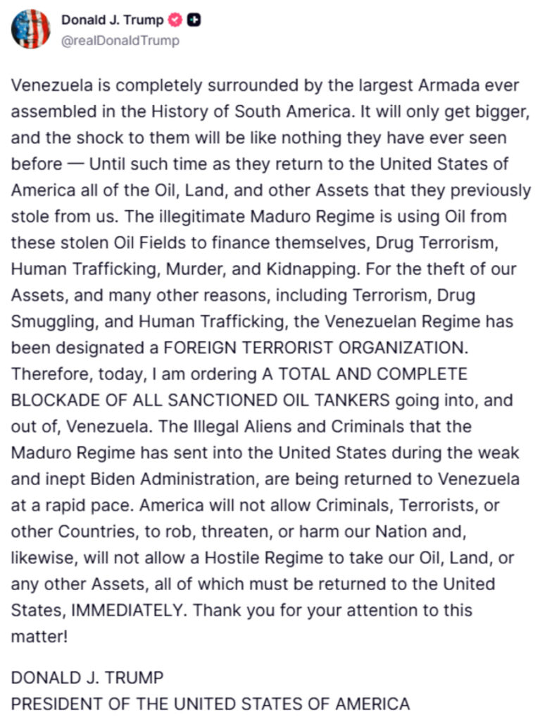 We wtorek prezydent Trump opublikował post na Truth Social, w którym ogłosił „całkowitą i totalną blokadę” wszystkich „objętych sankcjami tankowców” wpływających do Wenezueli lub z niej wypływających, kontynuując agresywne działania przeciwko temu krajowi w celu obalenia prezydenta Nicolasa Maduro.